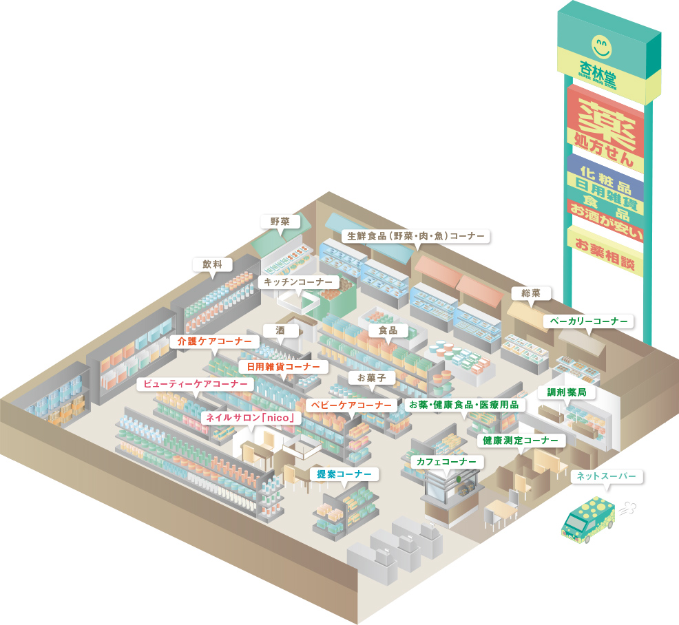 広く食事の大切さをお伝えする“杏林堂薬局独自の調剤併設型ドラッグストア”を展開しています。